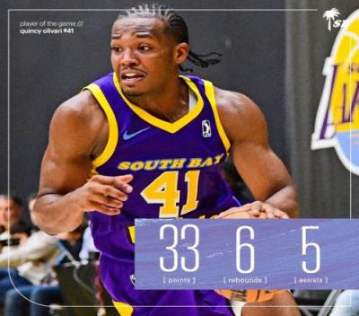 此役,湖人双向合同球员、后卫奥利瓦里为南湾湖人出场37分钟21投7中,三分13中5,罚球11中9,拿下33分6篮板5助攻2抢断。