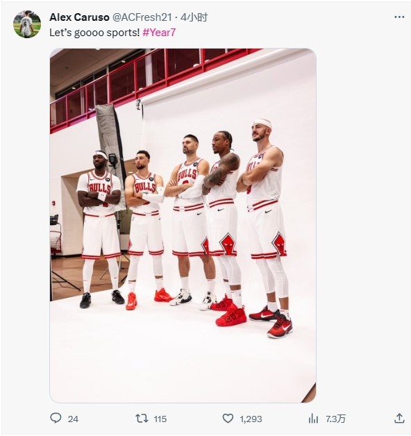 公牛队的球员卡鲁索在个人社交媒体上晒出了他的新赛季定妆照,并在帖子中写道:“第七个赛季,让我们开打吧!”这显示出他对新赛季的期待和渴望。