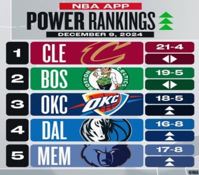 体育资讯12月10日报道宣称 NBA官方公布了最新一期战力榜,其中骑士、绿军稳居前2,灰熊近10战9胜跻身前5。