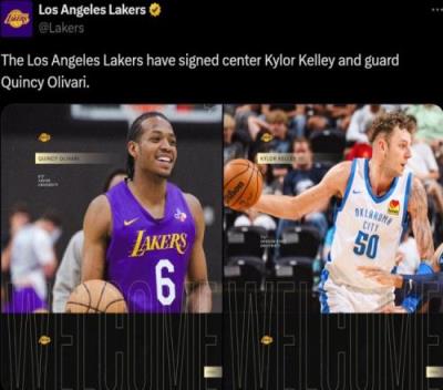 体育资讯8月15日报道宣 今天,湖人官推官宣签下两位球员,他们分别是中锋凯勒-凯利和后卫昆西-奥利瓦里。
