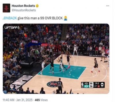 火箭官推转发了这个盖帽,并@NBA 2K官方道:“给这个小伙子99分的盖帽值吧。”
