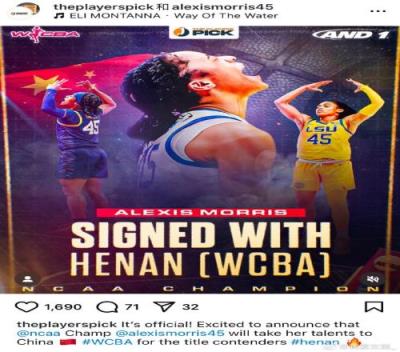 昨天深夜,据经纪公司ThePlayersPick消息,原路易斯安那州立大学女篮后卫艾里克西斯-莫里斯签约河南女篮。艾里克西斯身高1米75,今年25岁,曾随路易斯安那州立大学女篮夺得2023年NCAA全国冠军。2023年WNBA选秀总第22顺位被康涅狄格太阳队选中。