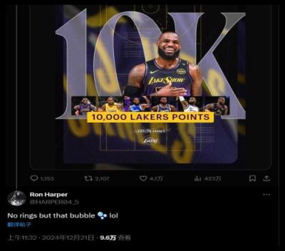 而奥尼尔的前队友,罗恩-哈珀却回复道:“没有戒指,只有泡泡