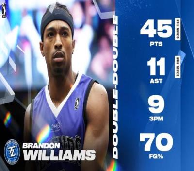 传奇队阵中4人得分上双,其中独行侠双向合同球员布兰登-威廉姆斯大发神威,他23投16中,三分13中9、罚球3中3,狂砍45分4篮板11助攻1抢断1盖帽。