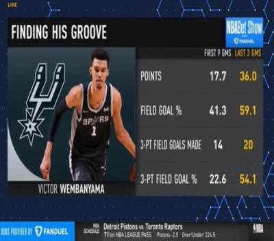 而在最近3场比赛中,文班亚马场均可以得到36分,投篮命中率59.1%,共命中20记三分,三分命中率54.1%。
