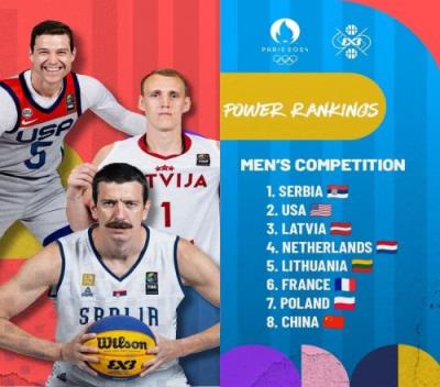 三人男篮方面,塞尔维亚队位列第1,美国队第2,拉脱维亚队第3,荷兰队第4,立陶宛队第5,法国队第6,波兰队第7,中国队第8。
