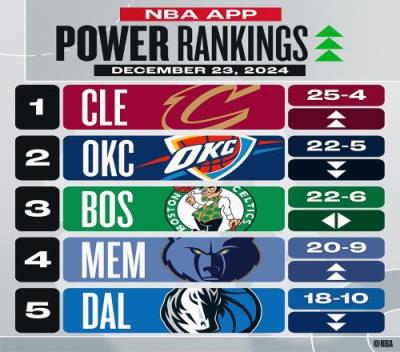体育资讯12月24日报道宣称 NBA官方公布了最新一期战力榜,其中骑士上升2名升至第一,雷霆降至第二,凯尔特人仍居第三,灰熊独行侠交换位置,勇士从第13升至第11,快船从第16升至第14,湖人从第18升至第15。详情如下(括号内为上期排名):