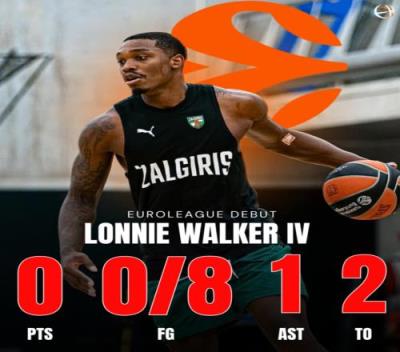 体育资讯11月08日报道宣称 朗尼-沃克今日在立陶宛球队BC Zalgiris Kaunas完成了欧洲篮球首秀。