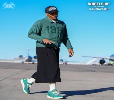 潮流先锋!威少黑帽子绿夹克显眼黑色阔腿裤像是穿了裙子