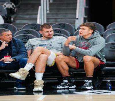 掘金官方晒照,博格丹与老乡约基奇在场边热聊,两人均来在塞尔维亚。