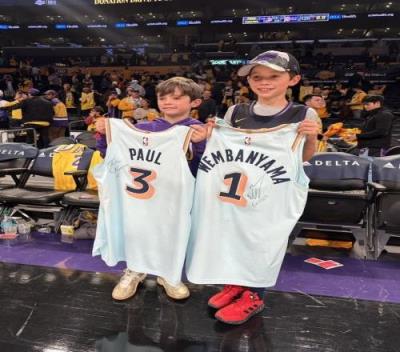 体育资讯1月14日报道宣称 NBA常规赛,马刺126-102战胜湖人。赛后,马刺球员保罗和文班亚马把自己的签名球衣送给了雷迪克的儿子。