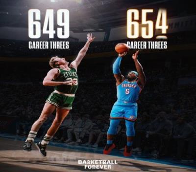 本场比赛前多特的生涯三分命中数为648个,加上今天的6个后,他在历史三分命中数榜单上也超越了绿军名宿“大鸟”伯德(649),排名历史第200位。