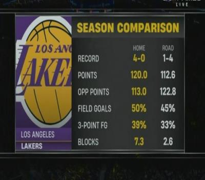 转播方晒出一组数据,本赛季至今湖人主客场数据差异明显: