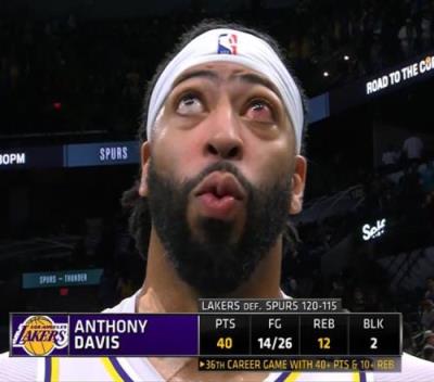 全场比赛,浓眉出战36分10秒,26投14中(三分4中2)、罚球12中10,轰下全场最高40分,外加12篮板2助攻1抢断2盖帽,正负值达+12。