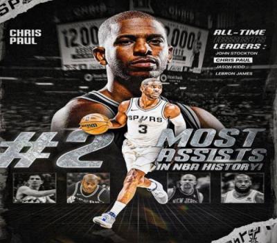 此役,保罗助攻数超越基德,上升到了NBA历史第二。