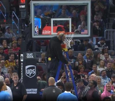 多姆“梅开二度”骑士主场迎战爵士赛前现场工作人员修篮筐