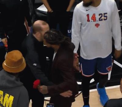 尼克斯主帅、前公牛主帅锡伯杜在比赛中和罗斯拥抱寒暄一番。