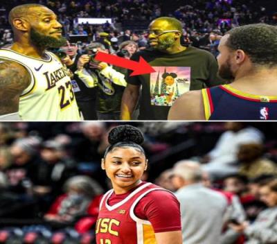 赛后,追梦走上赛场与詹姆斯库里互动,身上穿着一件印有美国天才女篮球员朱朱-沃特金斯 (JuJu Watkins)主题的T恤。