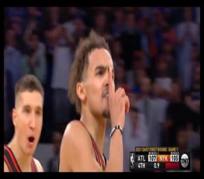 2021年季后赛首轮G1,“法克吹羊”的喊声第一次响彻在麦迪逊广场花园的上空,而特雷-杨也用一记抛投绝杀和闭嘴手势做出了最好的回应。