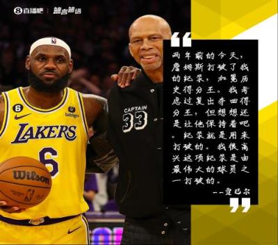 贾巴尔晒出了两人的合照,并写道:“两年前的今天,詹姆斯打破了我的得分纪录,加冕NBA历史得分王。我考虑过从退役中复出,去把得分王夺回来,但我又想,‘还是让他保持着吧。’我永远是老将。纪录就是用来打破的,我很高兴这项纪录是由最伟大的球员之一打破的。”