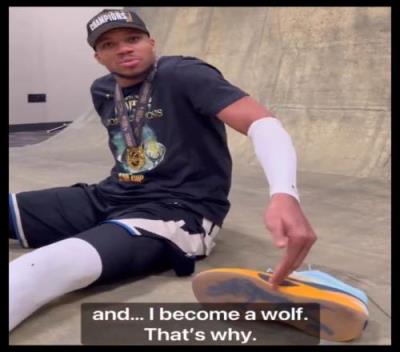 赛后,字母哥当选杯赛MVP,他也在激动之余向记者解释了自己球鞋底部狼图案设计的用意。