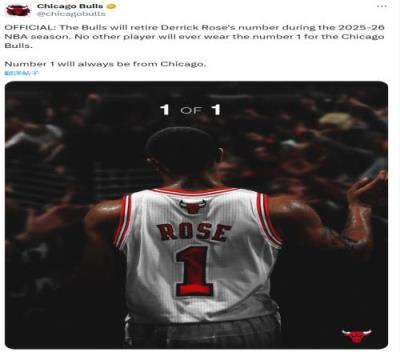 公牛官推官方:公牛将会在2025-26赛季退役德里克-罗斯的球衣,不会再有其他的公牛球员身穿1号球衣,一号(第一名)永远来自芝加哥。