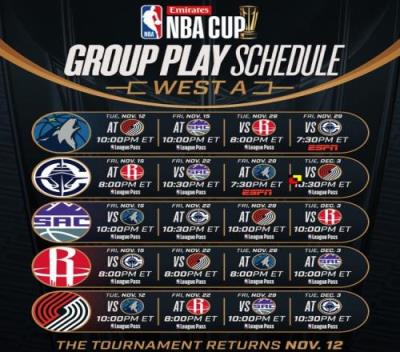 体育资讯8月14日报道宣 今天,NBA官方公布了24-25赛季NBA杯(原季中锦标赛)的分组及赛程。