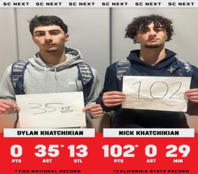 Nicholas Khatchikian在29分钟内60投48中,砍下了102分,打破加州高中历史得分纪录。