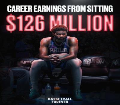 美媒BasketballFovever:“恩比德生涯缺席了400场比赛,躺着挣了125,695,189美金,这比爱德华兹、拉梅洛-鲍尔、亚历山大、莫兰特、希罗、马克西生涯总收入还多。”