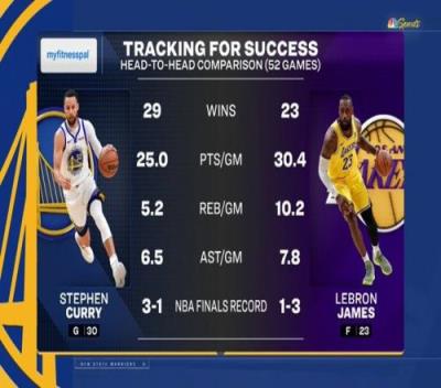 赛前转播方晒出库里和詹姆斯的生涯交手记录,两人共交锋52次,库里29胜23负略占上风,总决赛系列赛库里3胜1负。个人具体数据如下: