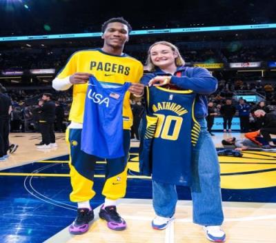 赛前步行者球员马瑟林与美国残疾人田径运动员、2024年巴黎残奥会金牌获得者诺埃尔-马尔卡马基交换球衣。