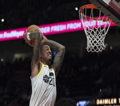 此役爵士前锋约翰-科林斯内外开花高效终结,打了33分钟9投8中,三分2中2、罚球1中1拿到19分6篮板2盖帽,正负值+10。