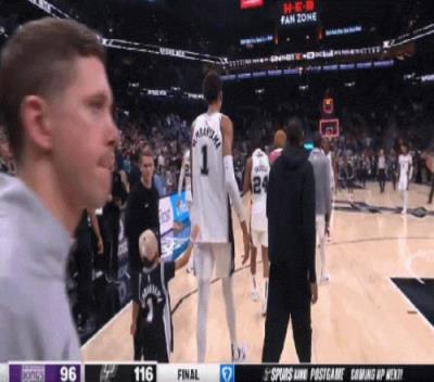 赛后,有一名小朋友跑到球场上找马刺球员维克托-文班亚马请求签名。随后文班亚马并没有给这名小朋友签名,而是脱下了自己身上所穿的球衣送给了这名小朋友(见新闻配图)。