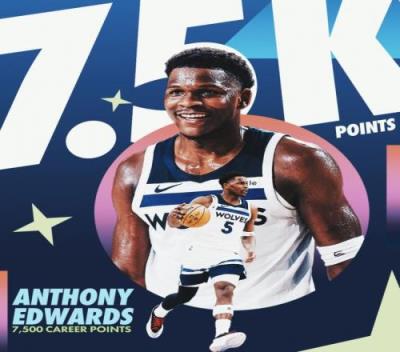 在本场比赛中,爱德华兹(23岁124天)常规赛生涯总得分突破7500,历史第三年轻,仅次于詹姆斯和杜兰特。