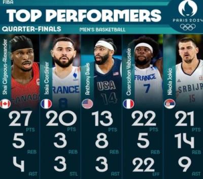FIBA评14决赛个人最佳表现:约基奇浓眉SGA领衔法国两奇兵上榜