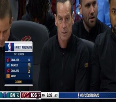 比赛中转播方给出一组数据,本赛季至今的连胜场数前四如下: