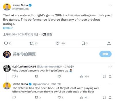 Buha还批评了球队的防守:“防守最近也一直很差。但之前湖人至少进攻还行,能看。现在是攻防两端都相当灾难。”
