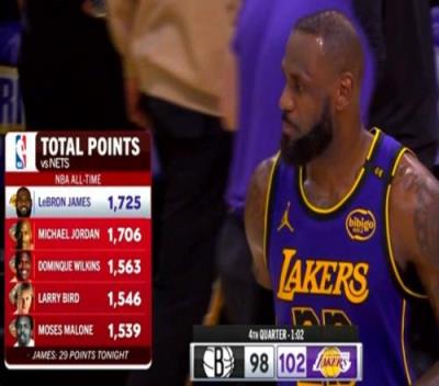 据统计,詹姆斯生涯面对篮网得到1725分,超越乔丹,上升至NBA历史第一。