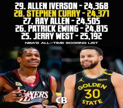 体育资讯1月15日报道宣称 在昨天不敌猛龙的比赛中,库里的生涯总得分超越艾弗森,上升至NBA历史第28位。