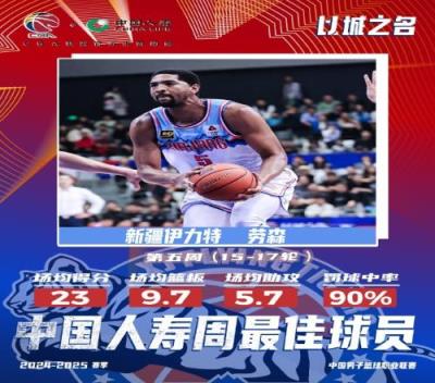 3战场均23分!CBA官方:新疆外援劳森当选常规赛第五周周最佳
