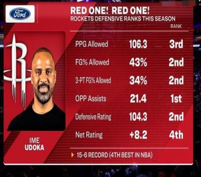 乌度卡执教有方!本季火箭多项防守数据联盟前3战绩&净效率第4
