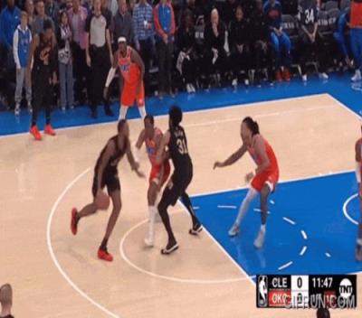 米切尔辛苦到篮下遭合围,球给出去,雷霆立刻接着围阿伦。