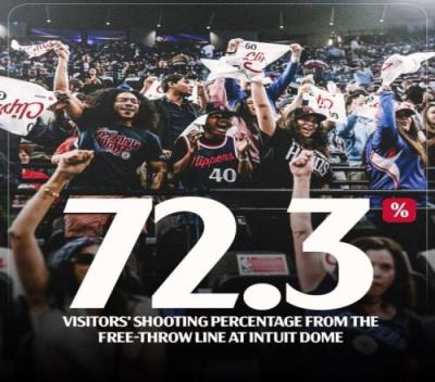 体育资讯12月4日报道宣称 今天,快船官方晒出了本赛季球队主场直觉巨蛋的客队罚球命中率,低至72.3%。