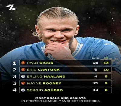 据One Football统计,哈兰德参加4场英超曼市德比,参与9粒进球(进球+助攻),英超曼市德比参与进球数量仅少于吉格斯、坎通纳。