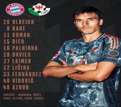 拜仁首发:26-乌尔赖希、9-凯恩、11-科曼、15-戴尔、16-帕利尼亚、19-戴维斯、27-莱默尔、32-利契纳、33-费尔南德斯、46-维多维奇、48-阿兹努