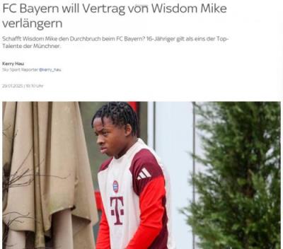 体育资讯1月30日报道宣称 德国天空体育消息,拜仁正和16岁天才边锋威斯多姆-麦克商谈续约。