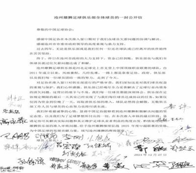 【相关】沧州全体球员签名公开信:就过往欠薪达和解,恳请足协酌情准入
