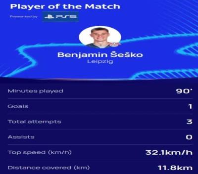 1球+6成功对抗!官方:塞斯科当选莱比锡vs葡体全场最佳