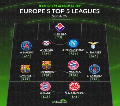 体育资讯11月17日报道宣称 WhoScored列出了本赛季至今五大联赛最佳阵容,凯恩、亚马尔、拉菲尼亚、穆西亚拉,德赫亚在列。