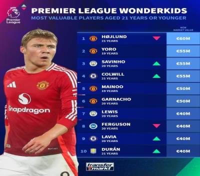 体育资讯12月17日报道宣称 德转盘点了英超U21球员身价前十榜单,霍伊伦6000万欧最贵,曼联4位球员在列。